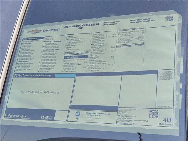 2024 Chevrolet Silverado 2500HD Work Truck CHECK OUT ALL THESE GREAT OPTIONS Preferred Equipment Group 1WT (170 Amp Alternator, 2-Speed Electronic Shift Transfer Case, 3.5 Diagonal Monochromatic Display DIC, Black Front Bumper, Black Mirror Caps, Black Rear Bumper, Bluetooth® For Phone, Chevrolet Connected Access Capable, Compass, HD Rear Vision Camera, High-Visibility Vertical Trailering Mirrors, Locking Tailgate, Manual Tailgate Function w/No EZ Lift, Manual Tilt-Wheel Steering Column, OnStar & Chevrolet Connected Services Capable, Power Door Locks, Power Front Windows w/Driver Express Up/Down, Power Rear Windows w/Express Down, Push Button Start, Rear 60/40 Folding Bench Seat (Folds Up), Remote Keyless Entry, Rubberized-Vinyl Floor Covering, Solar Absorbing Tinted Glass, Standard Tailgate, Wi-Fi Hotspot Capable, and Wireless Phone Projection), Snow Plow Prep/Camper Package (220 Amp Alternator), Suspension Package, WT Convenience Package (Deep-Tinted Glass, Electric Rear-Window Defogger, Electronic Cruise Control w/Set & Resume Speed, EZ Lift Power Lock & Release Tailgate, and Heated Vertical Trailering Mirrors), 120-Volt Interior Power Outlet, 3.73 Rear Axle Ratio, 4-Wheel Disc Brakes, 6 Speakers, 6-Speaker Audio System, 720 Cold-Cranking Amps Heavy-Duty Battery, ABS brakes, Air Conditioning, AM/FM radio, Apple CarPlay/Android Auto, Auto High-beam Headlights, Auto-Dimming Inside Rear-View Mirror, Brake assist, Chrome Front Bumper, Delay-off headlights, Driver door bin, Dual front impact airbags, Dual front side impact airbags, Durabed Pickup Bed, Electronic Stability Control, Front 40/20/40 Split-Bench Seats w/Lockable Storage, Front anti-roll bar, Front Center Armrest w/Storage, Front License Plate Kit, Front reading lights, Front wheel independent suspension, Fully automatic headlights, Heated & Auto-Dimming Vertical Trailering Mirrors, Illuminated entry, Integrated Trailer Brake Controller, Low tire pressure warning, Occupant sensing airbag, Outside temperature display, Overhead airbag, Overhead console, Panic alarm, Passenger door bin, Passenger vanity mirror, Power steering, Power windows, Premium audio system: Chevrolet Infotainment 3, Radio: Chevrolet Infotainment 3 System, Rear reading lights, Rear step bumper, Remote keyless entry, Split folding rear seat, Tachometer, Tilt steering wheel, Traction control, Trip computer, Upfitter Switch Kit (5), Variably intermittent wipers, Vinyl Seat Trim, Voltmeter, and Wheels: 17 Silver Painted Steel.